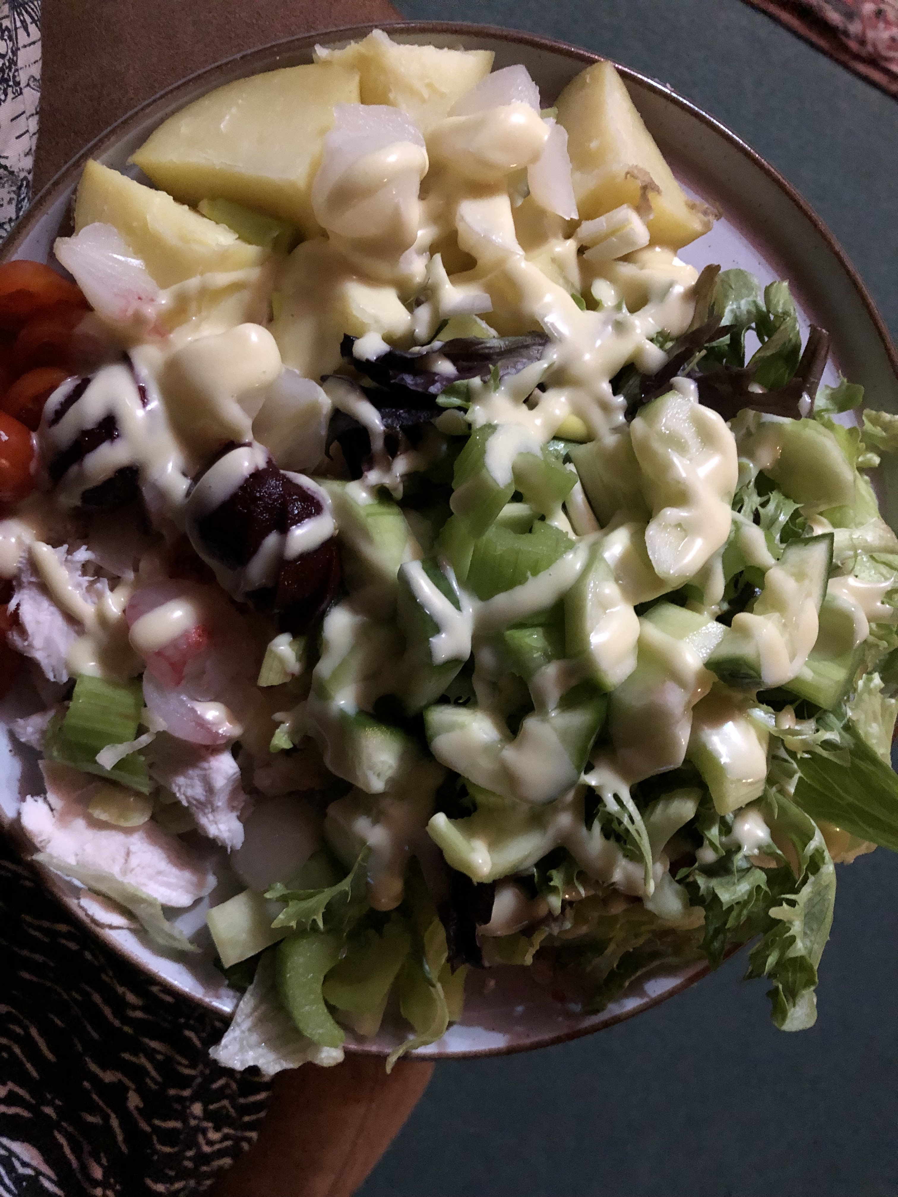 The Syns sound high but I am not worried, because they are the SW tool that allows you to eat normally within reasons with the ability to lose weight. I could have reduced the syns by using fat free quark or yogurt and lighter versions of the mayo/salad cream and actually quark is a really good carrier of flavour and I used to use quark and full fat mayo combination in 2017-2018 and I may again. But using the syns in this way allows the F8 to come through ( though technically speaking the salad cream would be off limits due to it's sugar content )